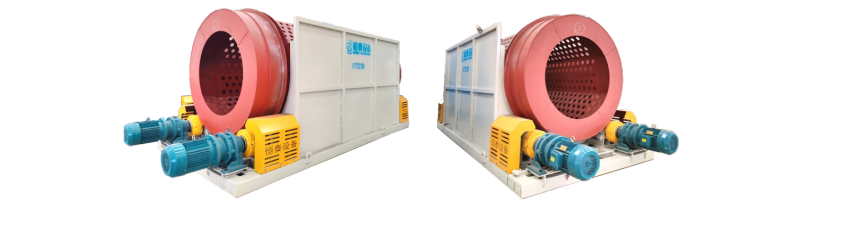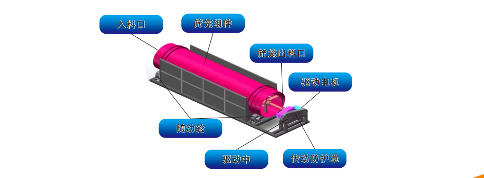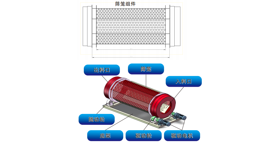 當(dāng)物料進(jìn)入滾筒裝置后,由于滾筒裝置的傾斜與轉(zhuǎn)動(dòng),使篩面上的物料翻轉(zhuǎn)與滾動(dòng),且物料隨滾筒旋轉(zhuǎn)至一定高度,由于重力作用被拋灑墜落,形成篩分,使合格物料(篩下產(chǎn)品)經(jīng)滾筒底部的出料孔排出,不合格的物流(篩上產(chǎn)品)經(jīng)滾筒尾部的排料口排出。